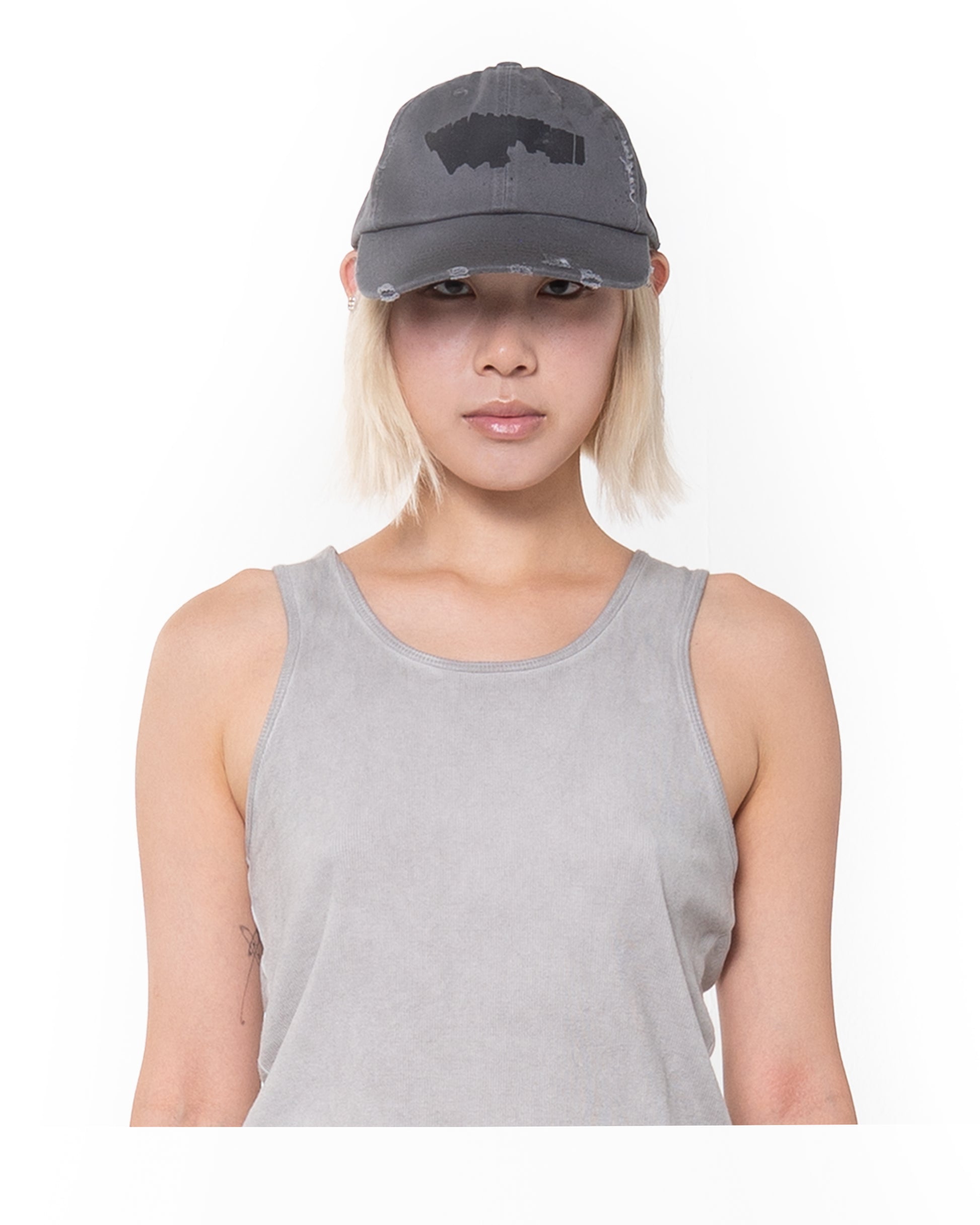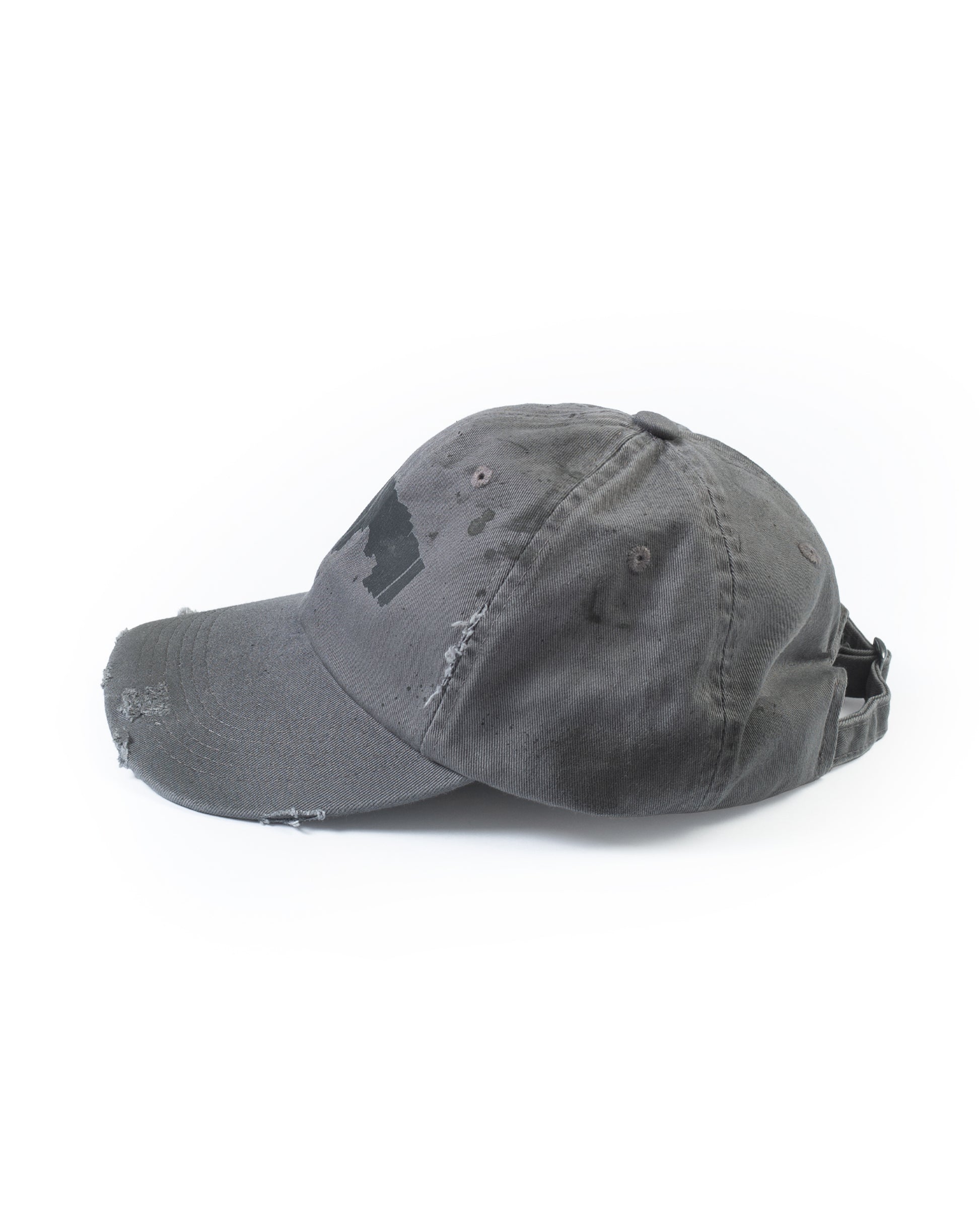 IMPORTED CHARCOAL 6 PANLE HAT WITH STRAP BACK, PRE DISTRESSED, REPAIRED IN HOUSE.