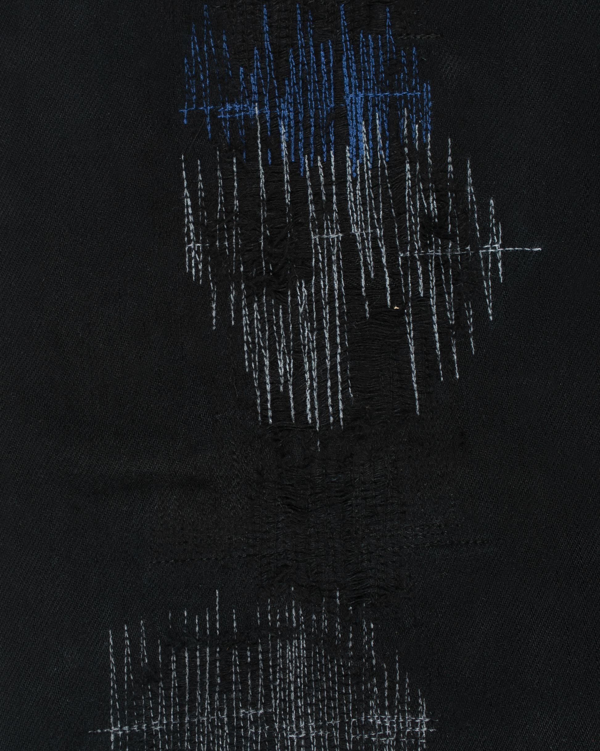 REPAIR ALL HOLES AND REINFORCE ANY WEAK SPOTS USING A VARIETY OF THREAD COLORS AND TECHNIQUES TO GIVE IT A LOOK MOST TRUE TO BEING REPAIRED OVERTIME