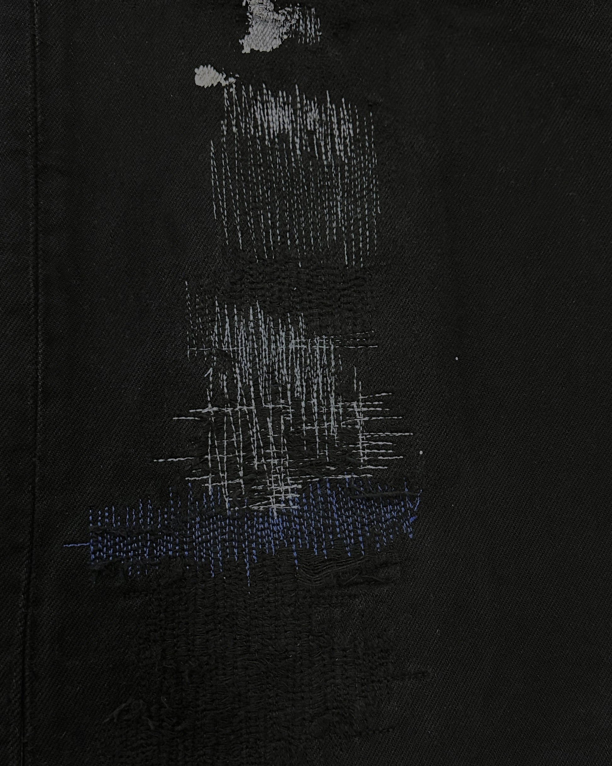 REPAIR ALL HOLES AND REINFORCE ANY WEAK SPOTS USING A VARIETY OF THREAD COLORS AND TECHNIQUES TO GIVE IT A LOOK MOST TRUE TO BEING REPAIRED OVERTIME