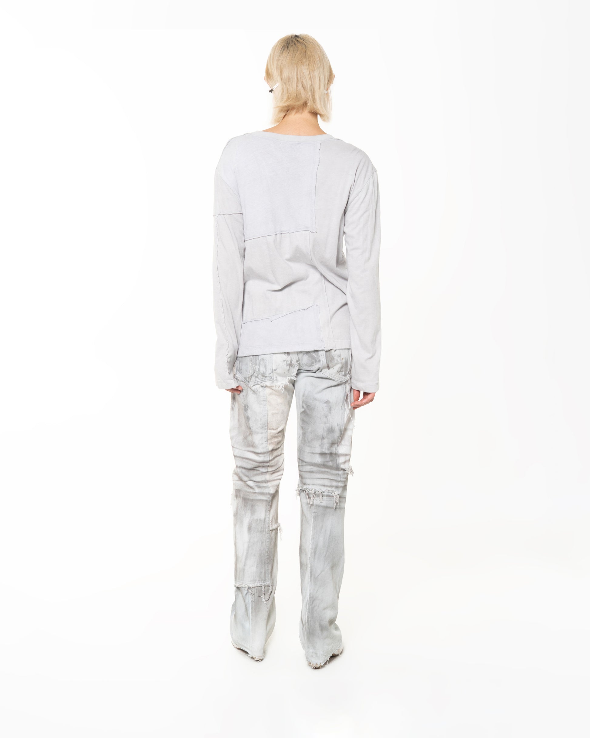 VARIOUS RAW AND FINISHED FABRIC EDGES THROUGHOUT THE FRONT AND BACK OF BOTH LEGS. STRAIGHT FIT.