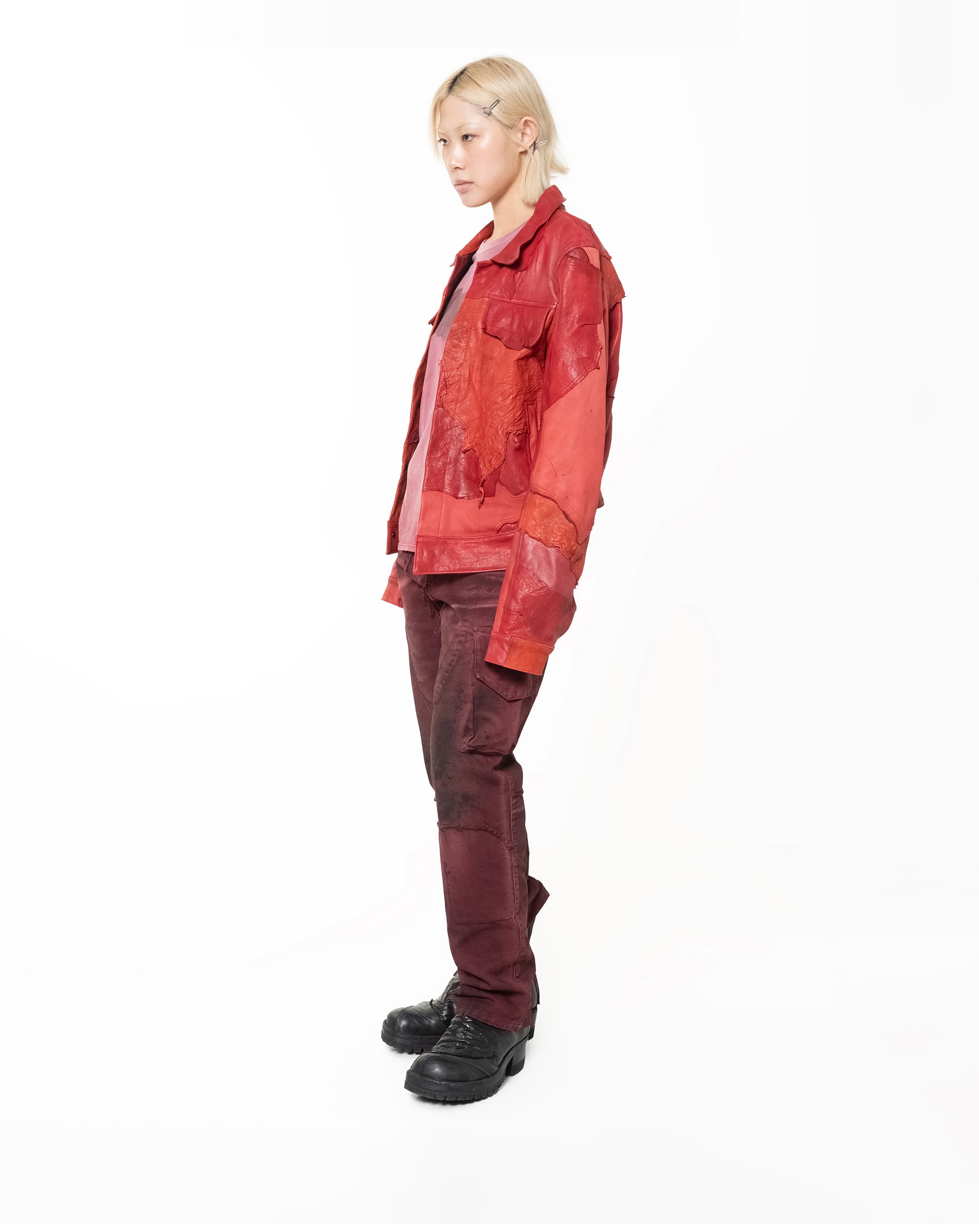 THIS SCRAP LEATHER JACKET IS MADE OUT OF 100% RECYCLED RED LEATHER SCRAP. COLLECTED FROM LOCAL BRANDS, AND ARTISANS. EACH PANEL IS INDIVIDUALLY PATCH-WORKED, 4 FRONT POCKETS, JAPANESE SILK / COTTON LINING.