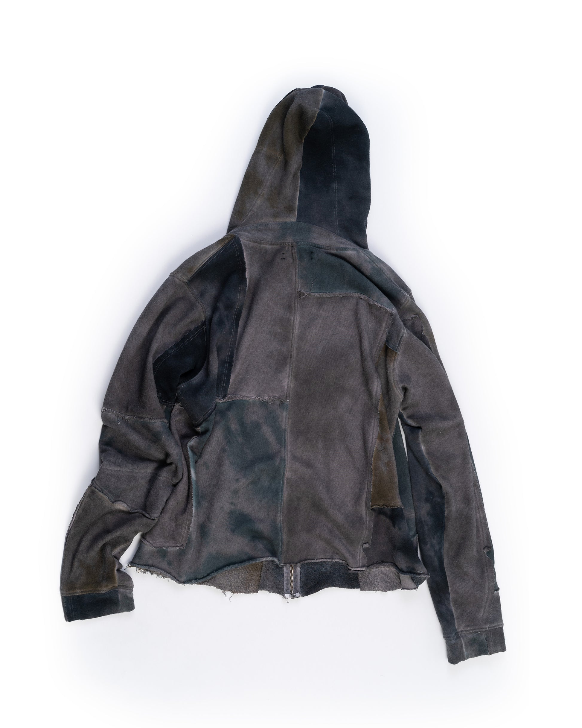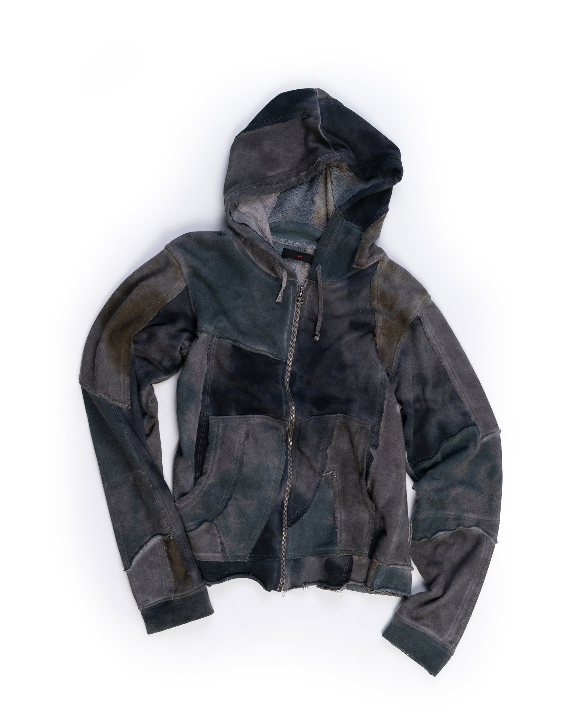 OUR SCRAP ZIPUPS ARE MADE OUT OF MID-WEIGHT, TIE DYED, FRENCH TERRY SCRAP. THEY FEATURES PATCHWORK FABRICATION, A KANGAROO POCKET, OVERLOCK CONSTRUCTION, AND JAPANESE STRINGS