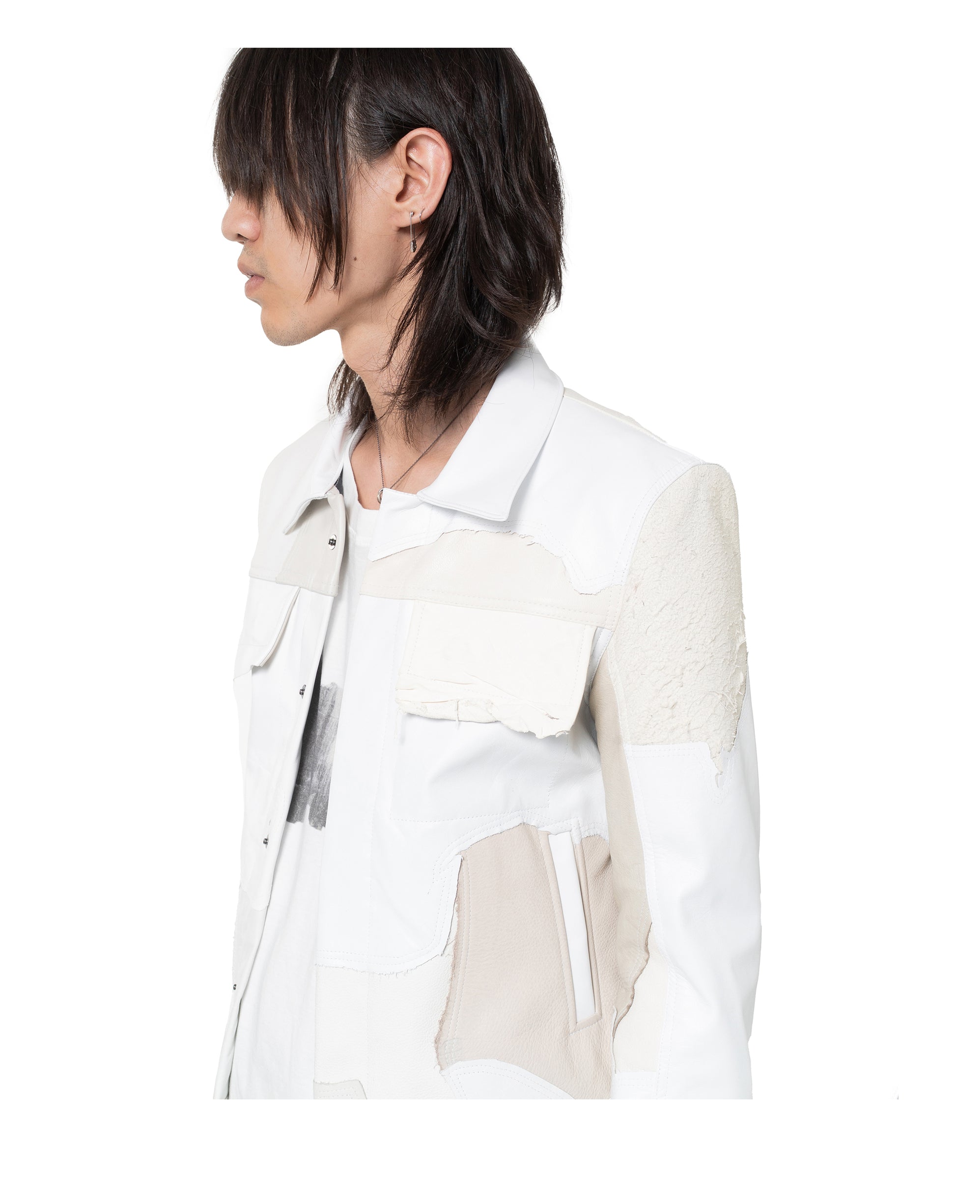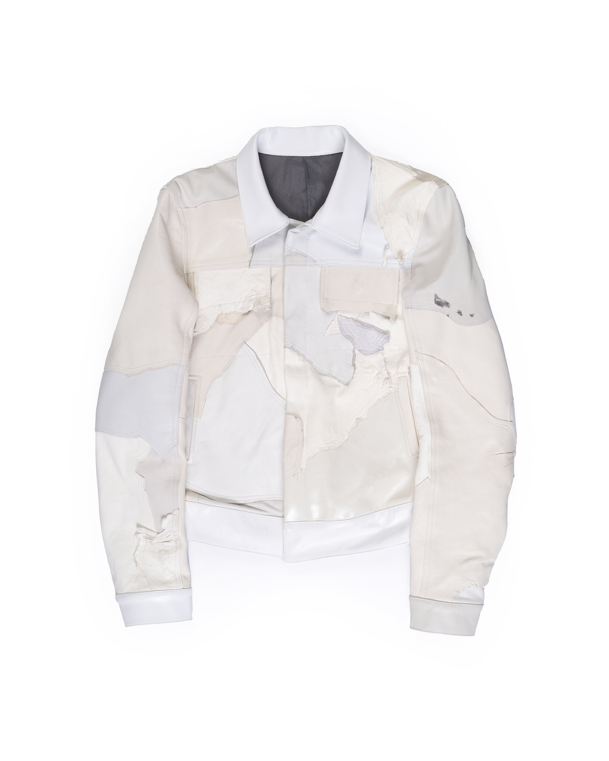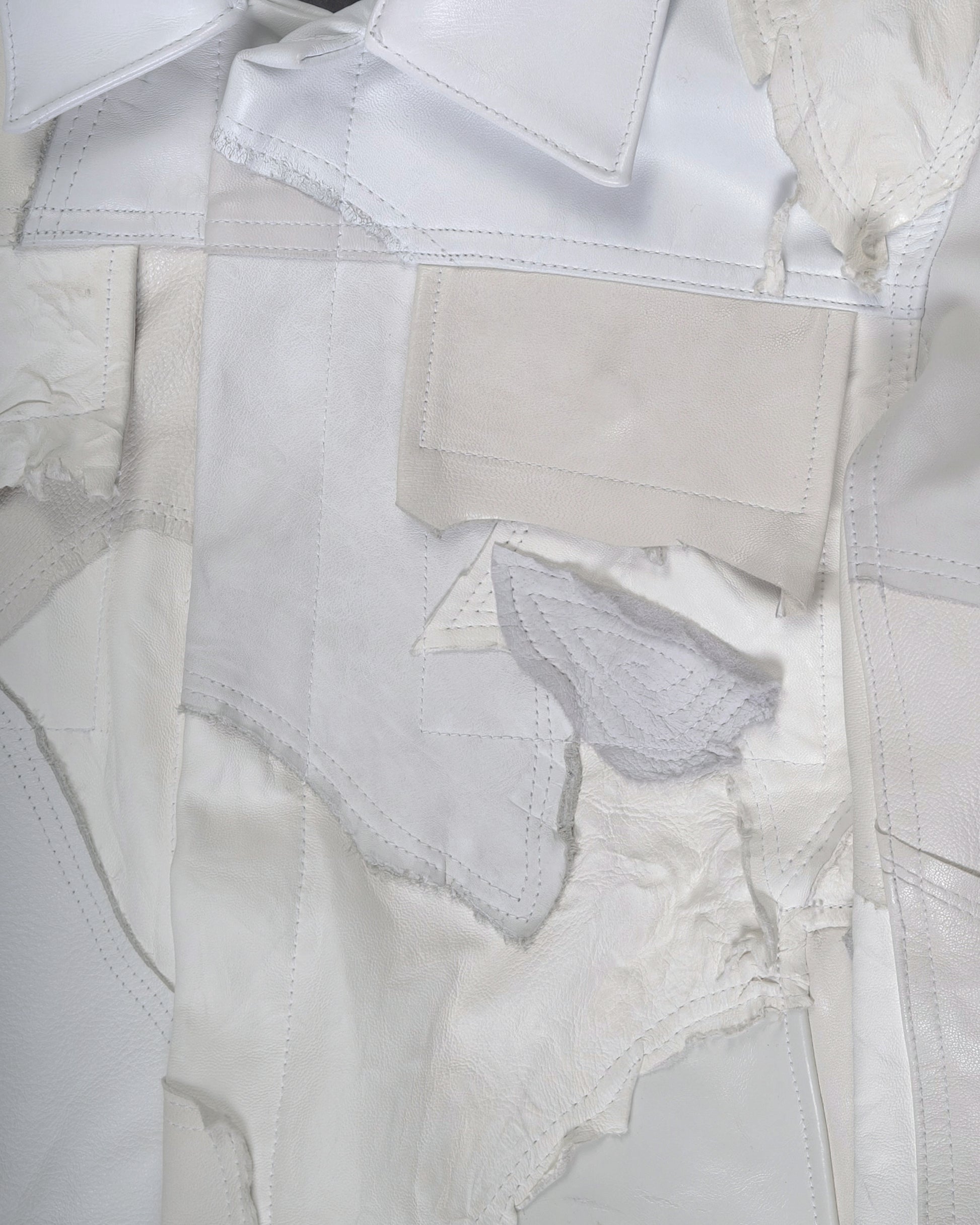 OUR SCRAP LEATHER JACKETS ARE MADE OUT OF 100% RECYCLED LEATHER SCRAP. COLLECTED FROM LOCAL BRANDS AND ARTISANS. EACH PANEL IS INDIVIDUALLY PATCH-WORKED, 4 FRONT POCKETS, DEADSTOCK SILK / COTTON LINING.